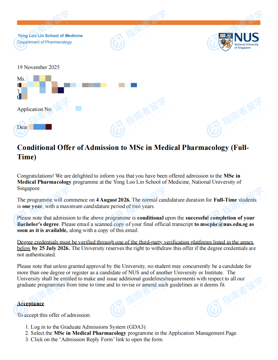 新加坡国立大学医学药理学理学硕士研究生offer一枚