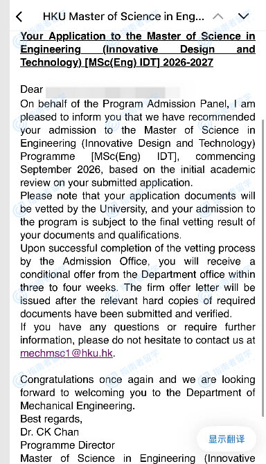 香港大学创新设计与科技(工程)理学硕士研究生offer一枚