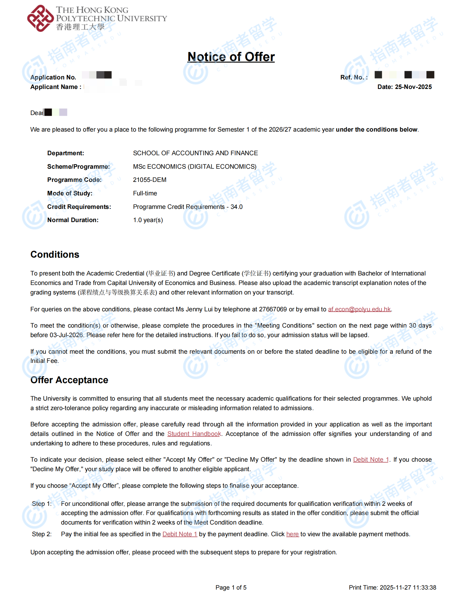 香港理工大学经济学理学硕士(数字经济学)研究生offer一枚