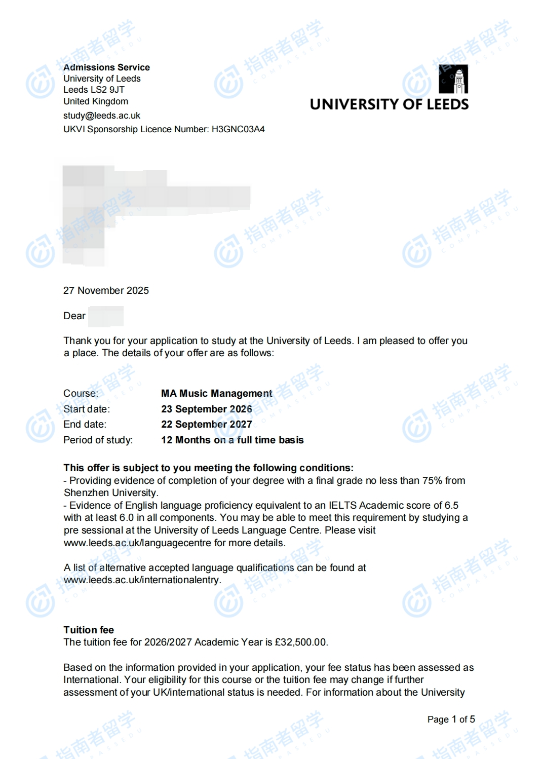 利兹大学音乐管理文学硕士研究生offer一枚