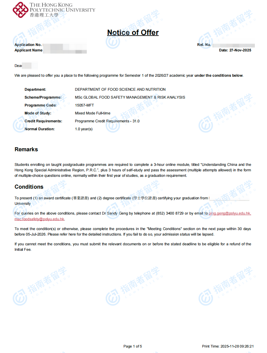 香港理工大学环球食品安全管理及风险分析理学硕士研究生offer一枚