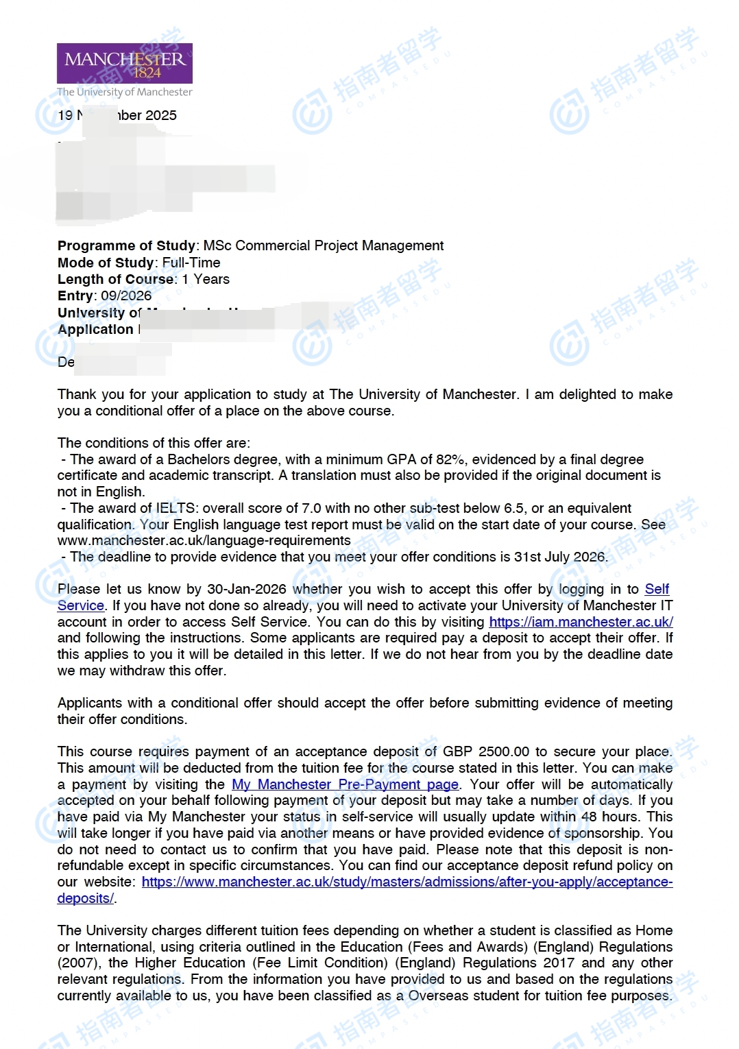 曼彻斯特大学商业项目管理理学硕士研究生offer一枚