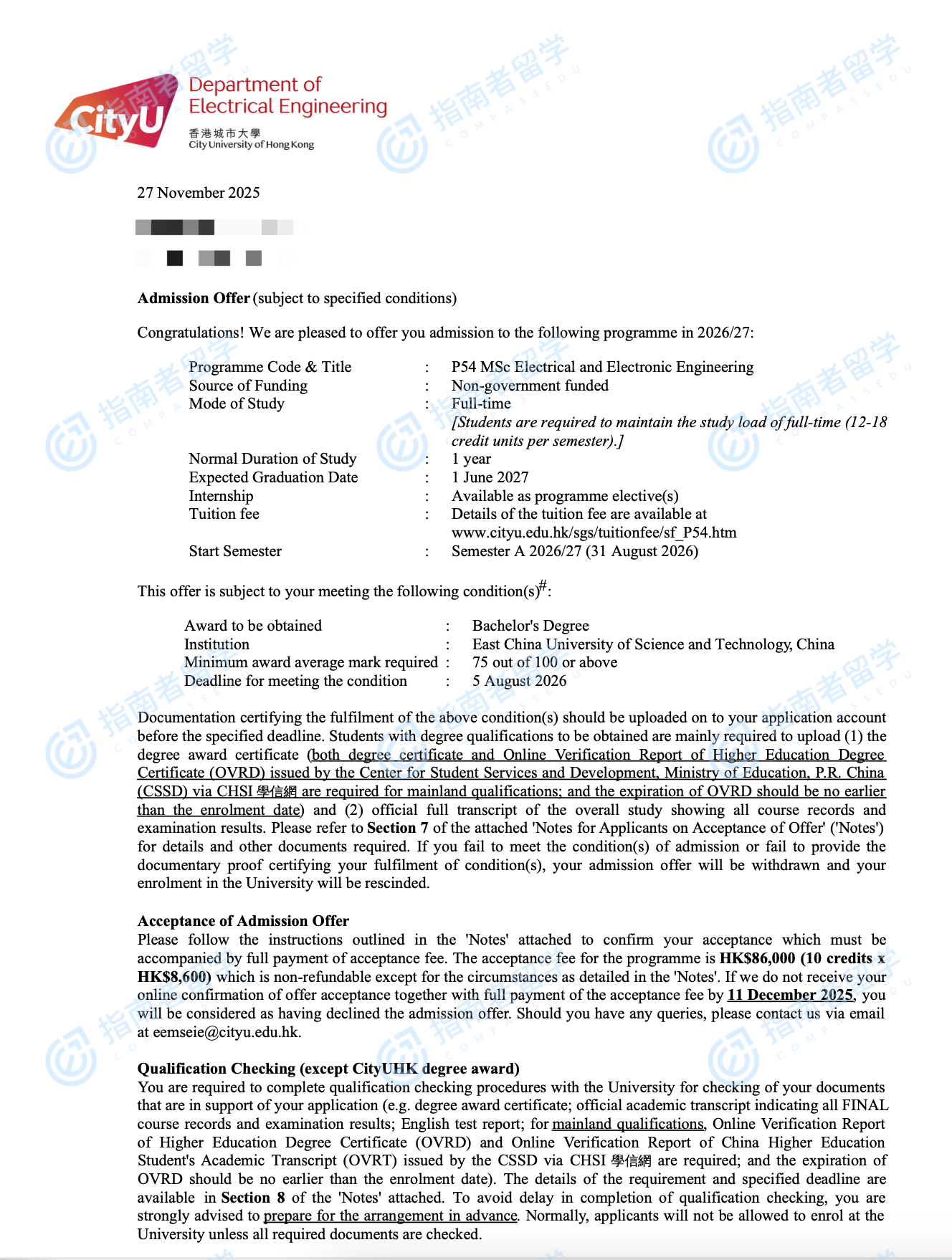 香港城市大学电机与电子工程学理学硕士研究生offer一枚