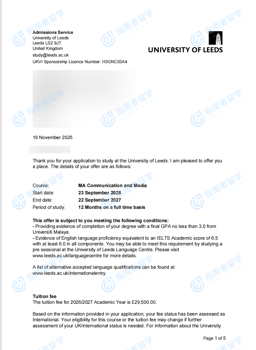利兹大学传播与媒体文学硕士研究生offer一枚