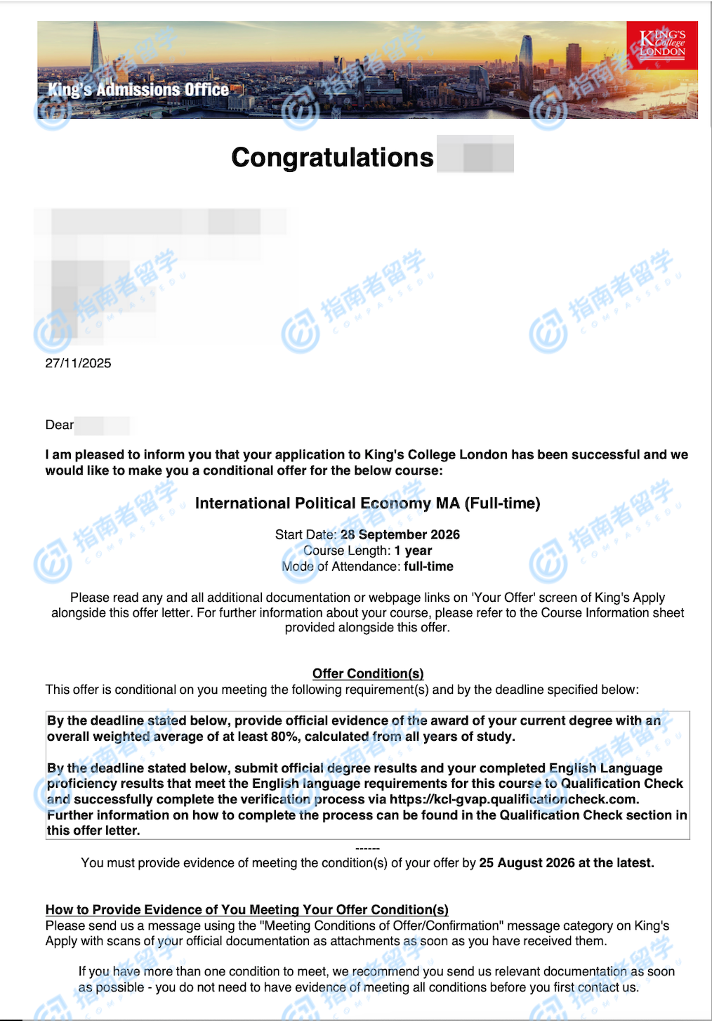 伦敦大学国王学院国际政治经济学文学硕士研究生offer一枚
