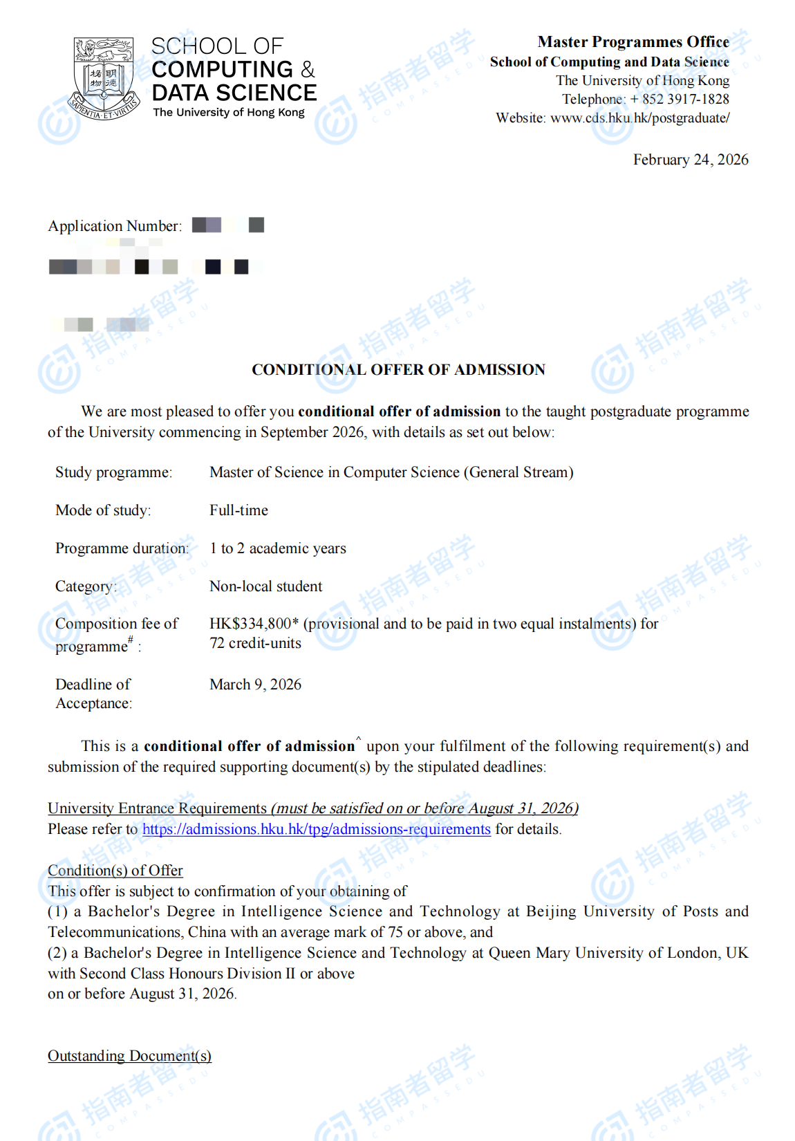香港大学计算机科学理学硕士(常规方向)研究生offer一枚