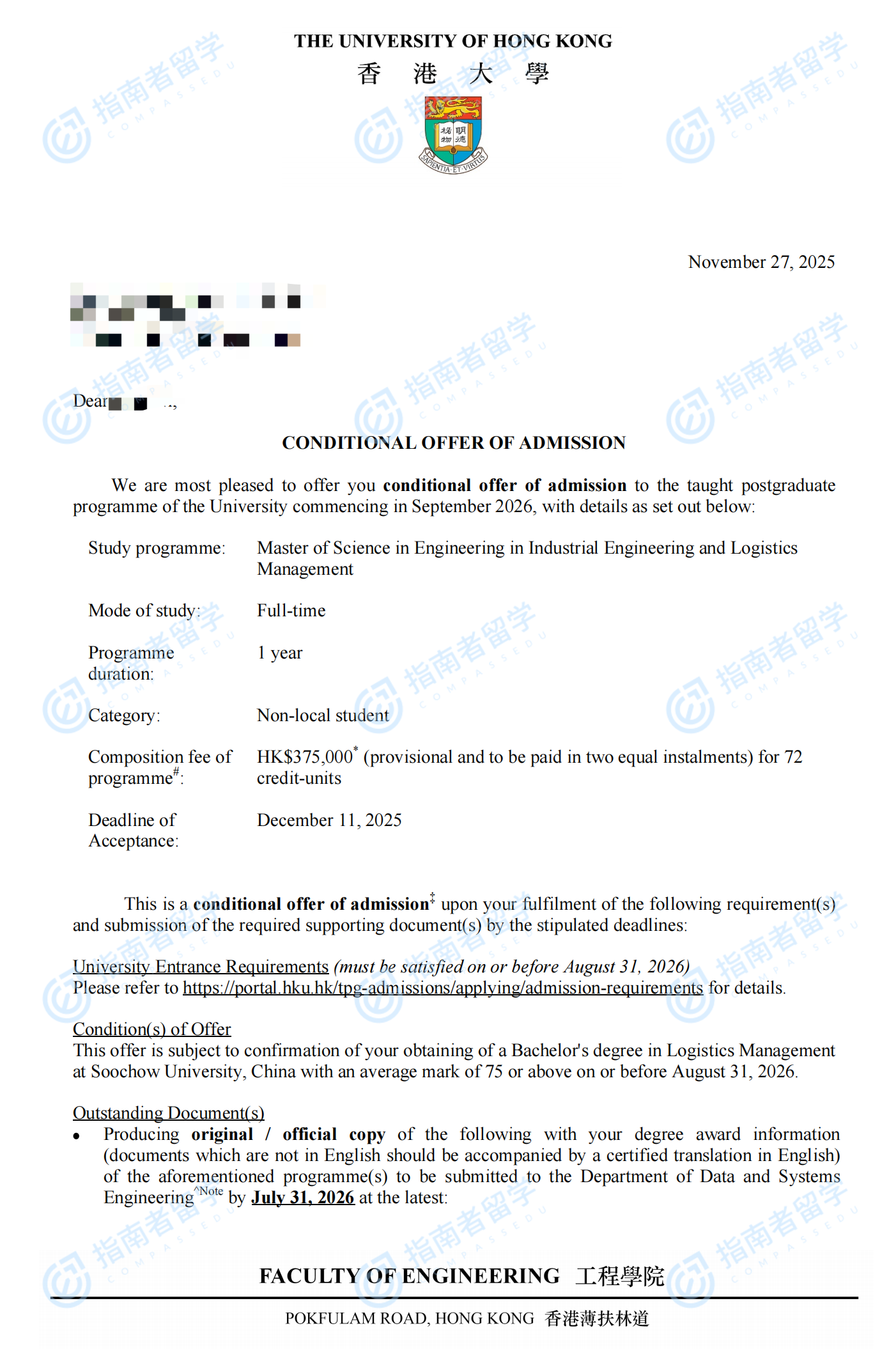 香港大学工业工程与物流管理(工程)理学硕士研究生offer一枚