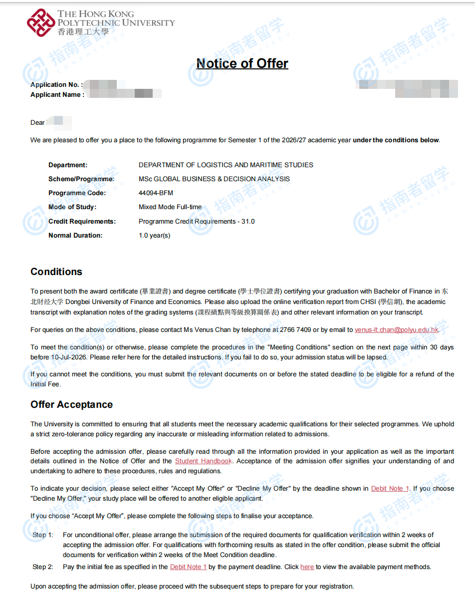 香港理工大学环球商业与决策分析理学硕士研究生offer一枚