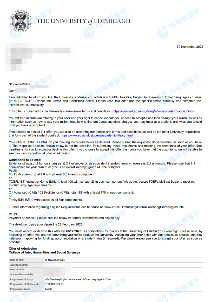 爱丁堡大学对外英语教学理学硕士研究生offer一枚
