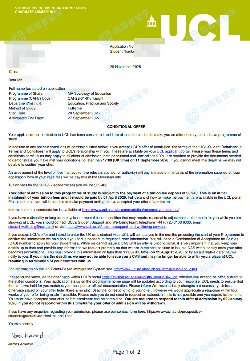 伦敦大学学院教育社会学文学硕士研究生offer一枚
