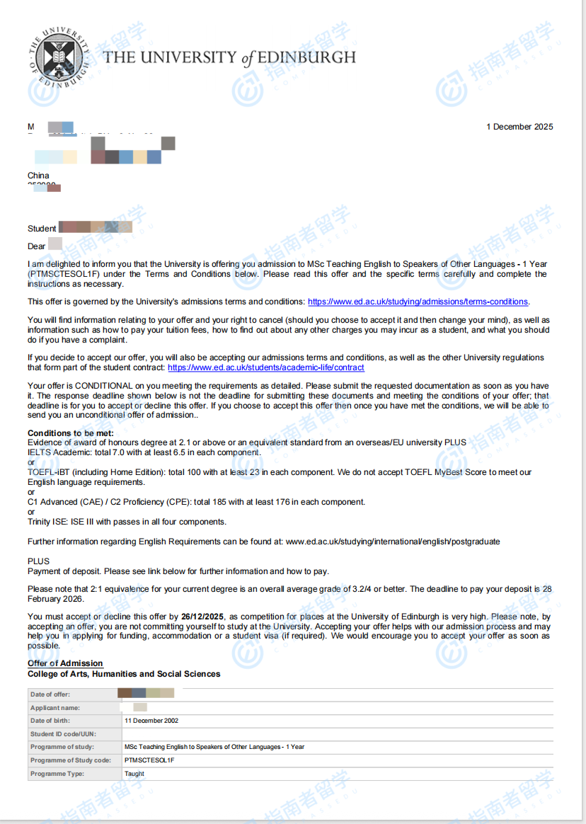 爱丁堡大学对外英语教学理学硕士研究生offer一枚