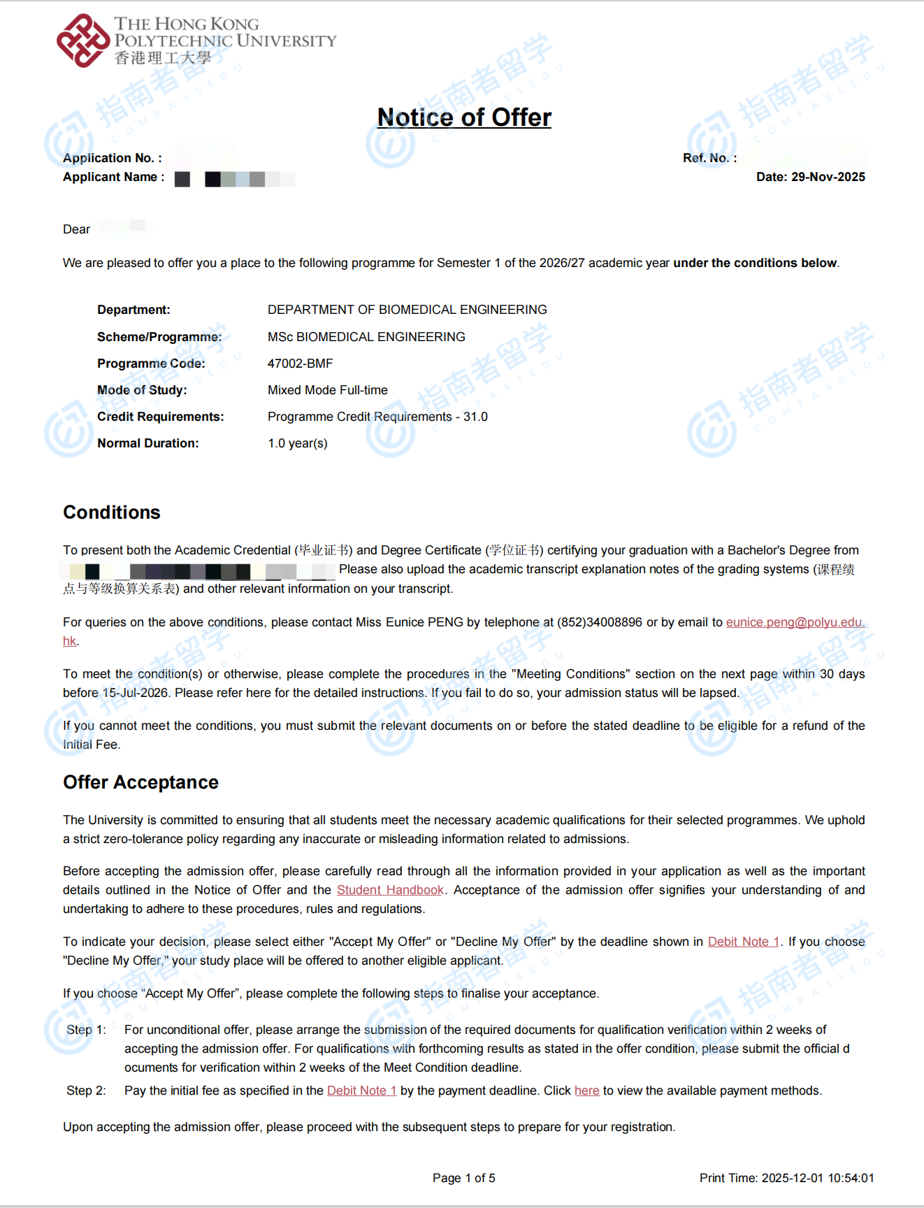 香港理工大学生物医学工程理学硕士研究生offer一枚