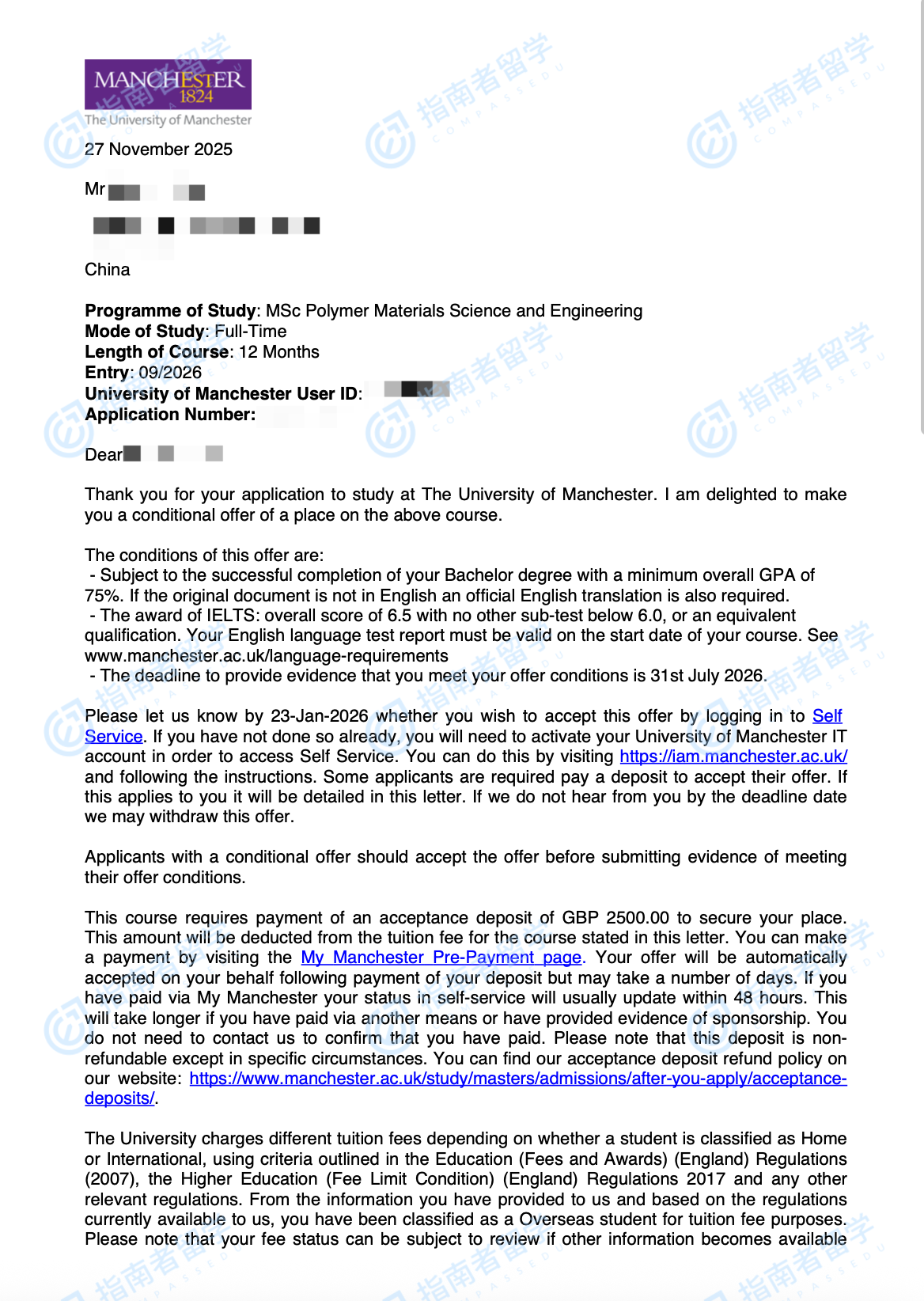 曼彻斯特大学高分子材料科学与工程理学硕士研究生offer一枚