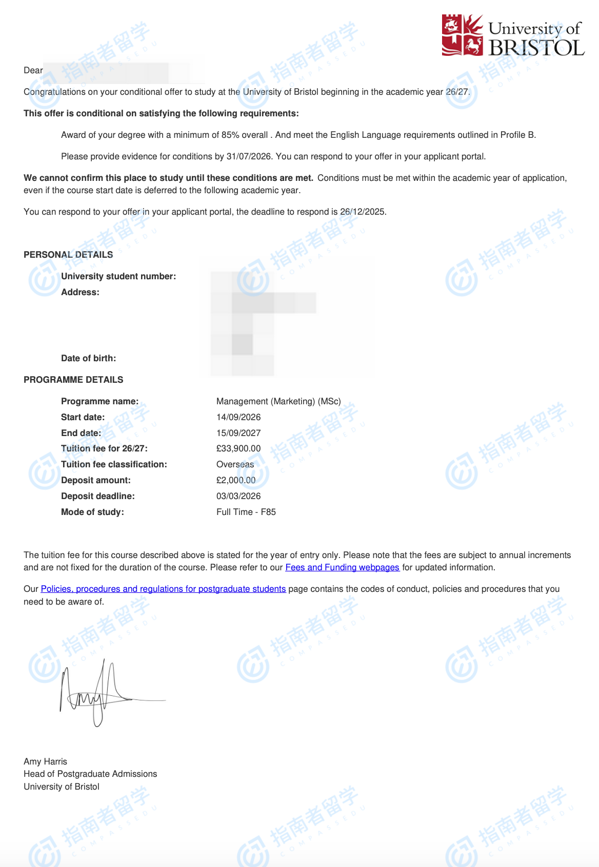 布里斯托大学管理学理学硕士(市场营销 )研究生offer一枚
