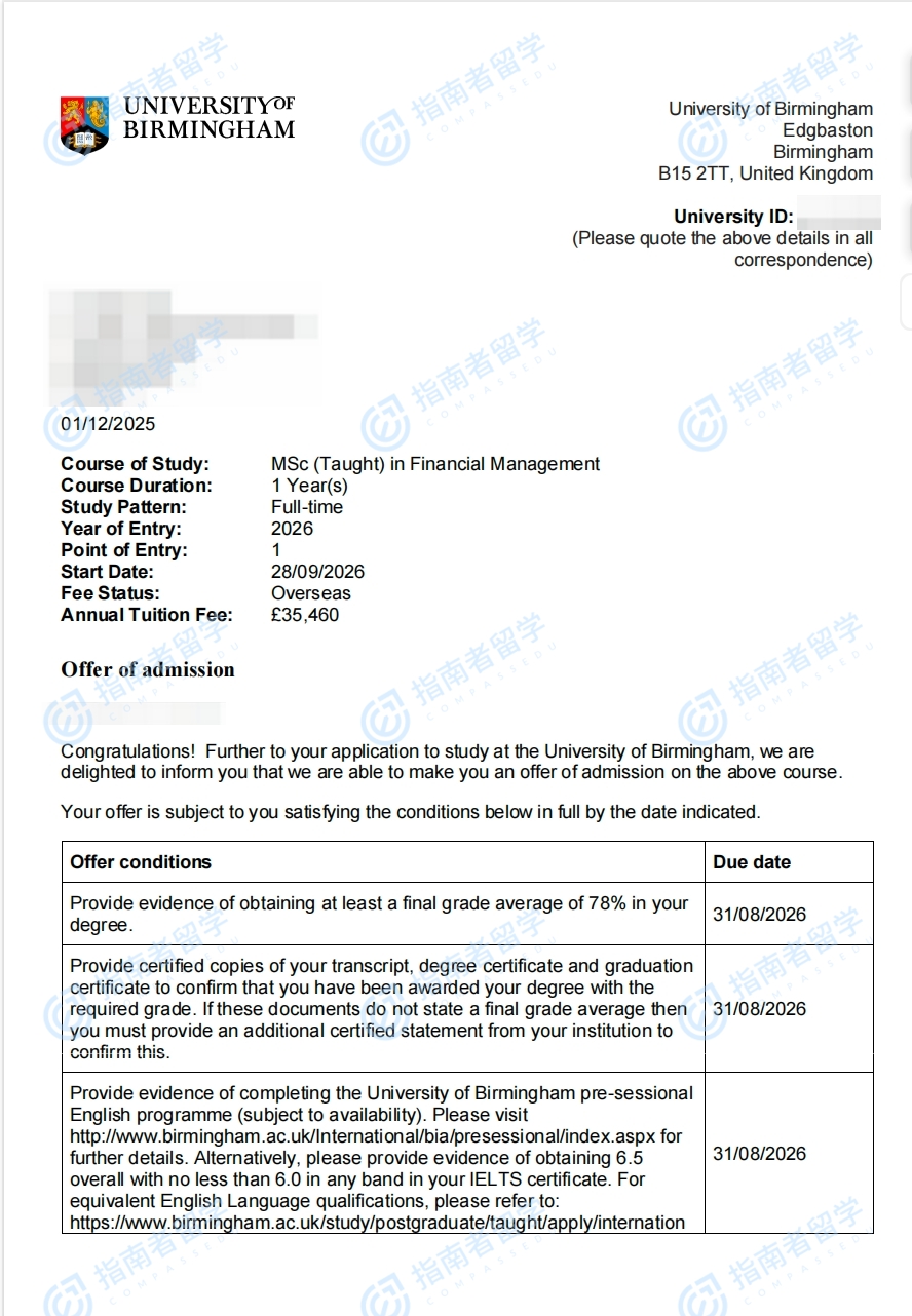 伯明翰大学财务管理理学硕士研究生offer一枚