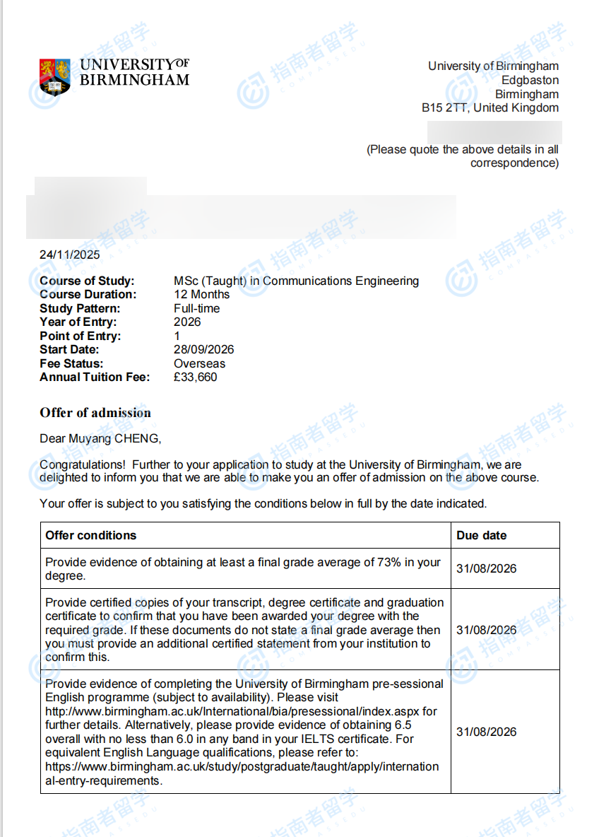 伯明翰大学通信工程理学硕士研究生offer一枚