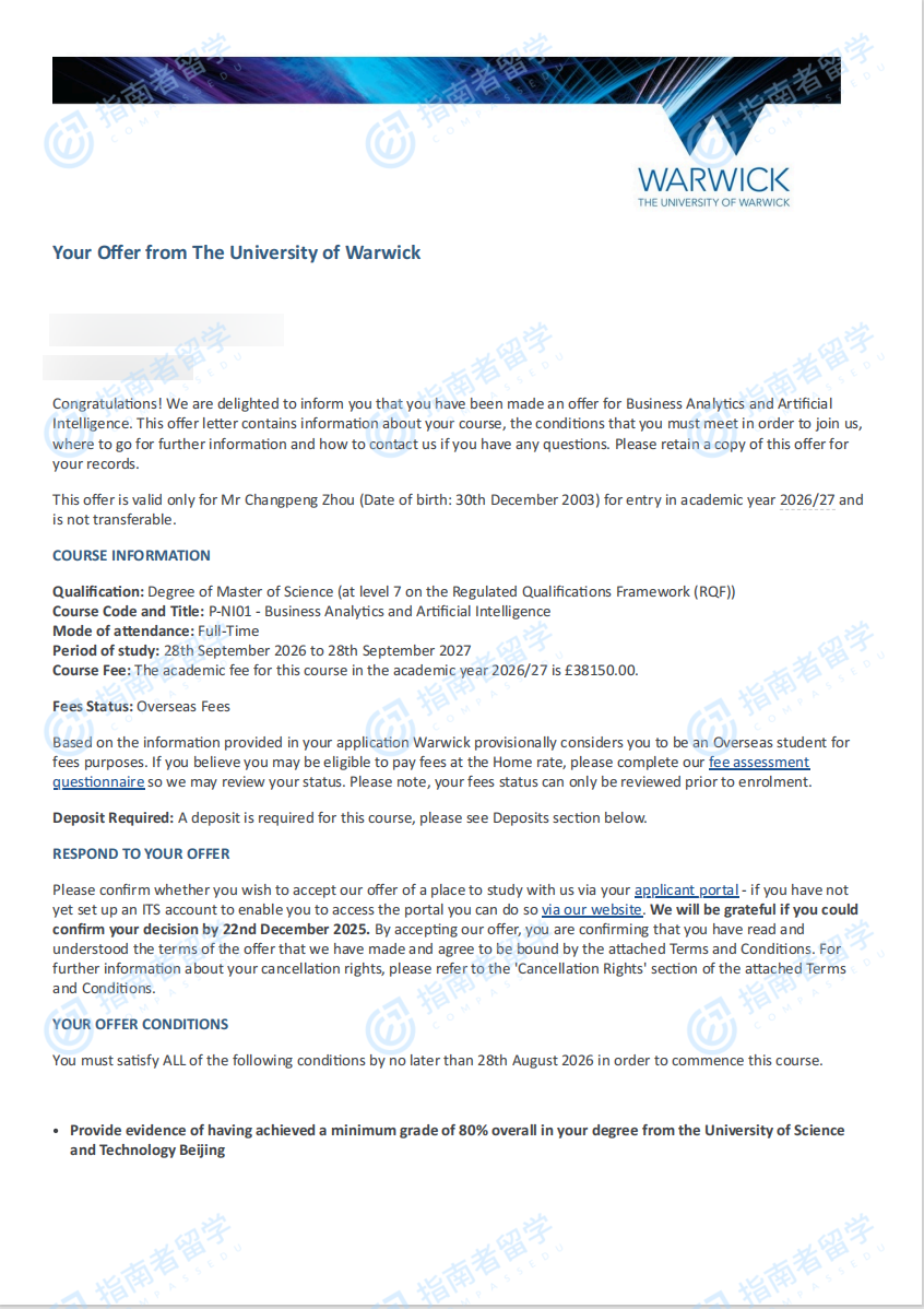 华威大学商业分析&人工智能理学硕士研究生offer一枚