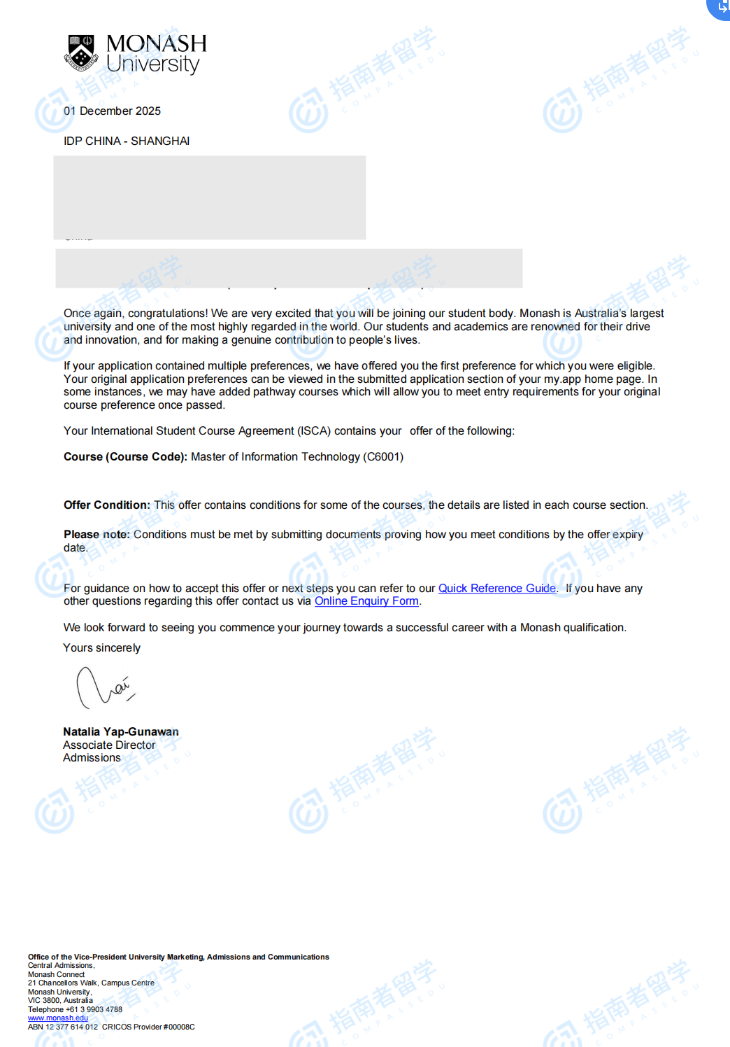 莫纳什大学信息技术硕士(2年制)研究生offer一枚
