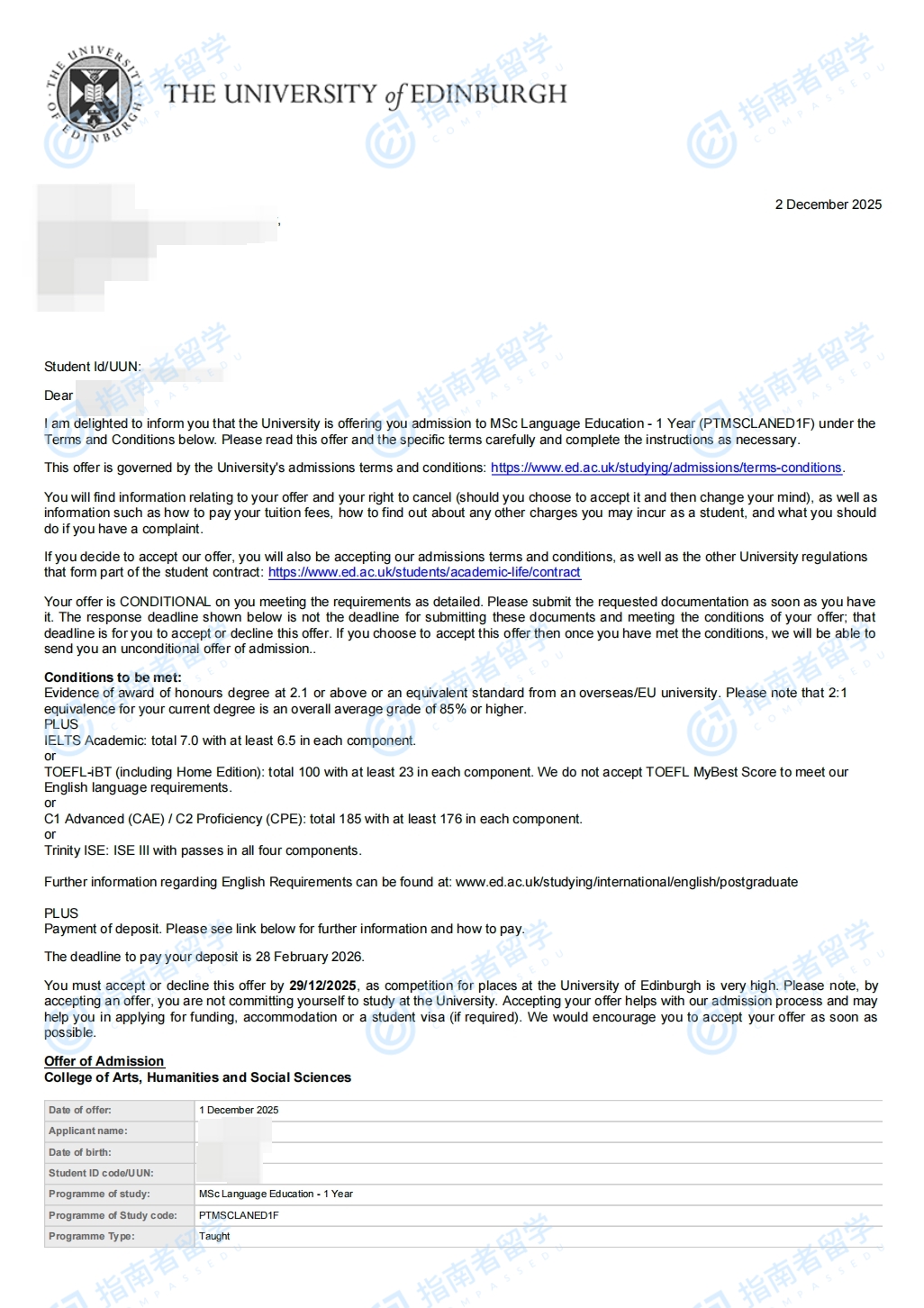 爱丁堡大学语言教育理学硕士研究生offer一枚
