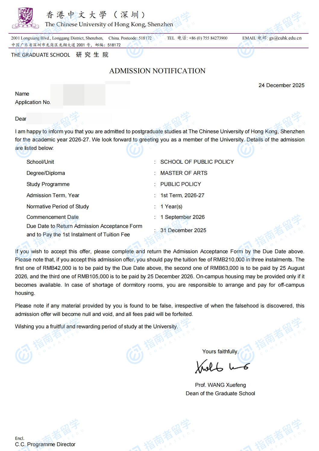 香港中文大学公共政策文学硕士(CUHK-Shenzhen)研究生offer一枚