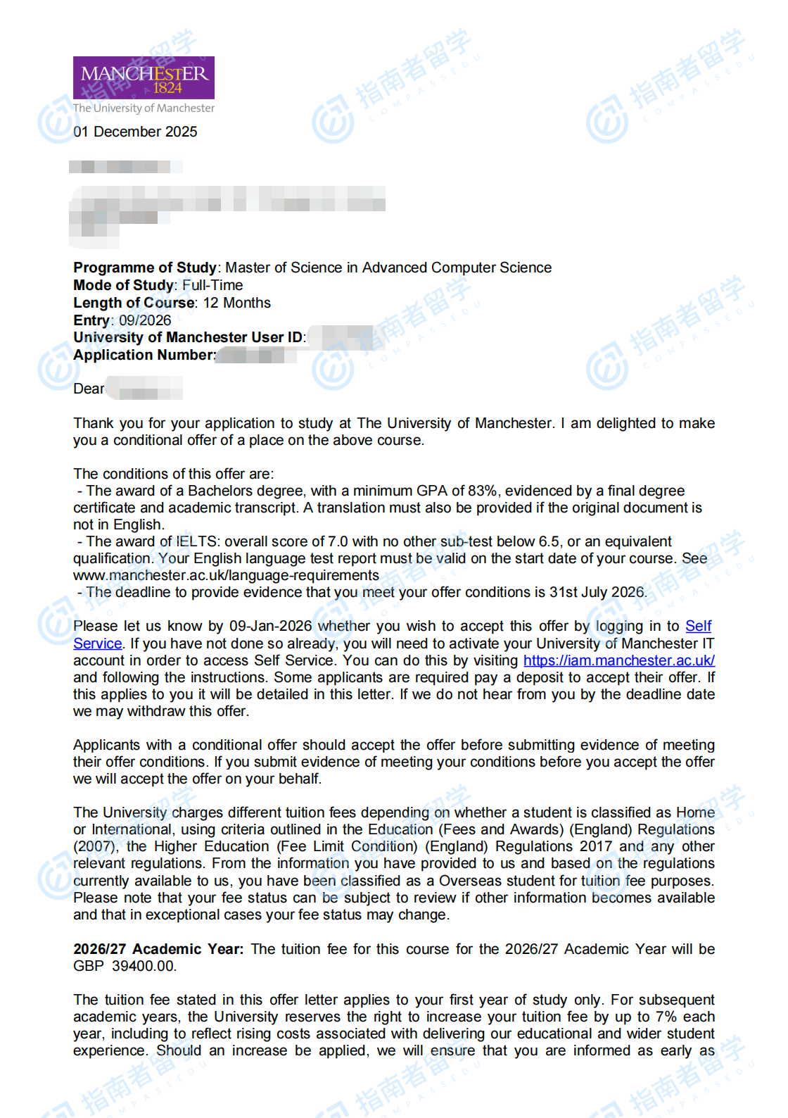 曼彻斯特大学高级计算机科学理学硕士研究生offer一枚