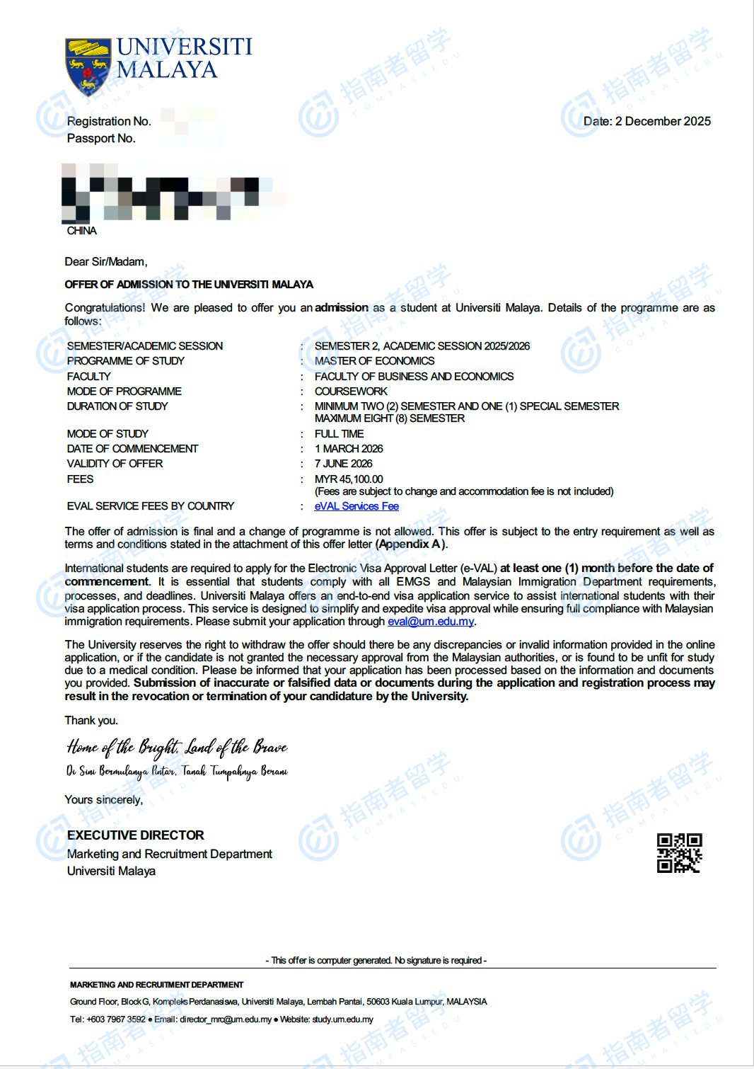 马来亚大学经济学硕士研究生offer一枚