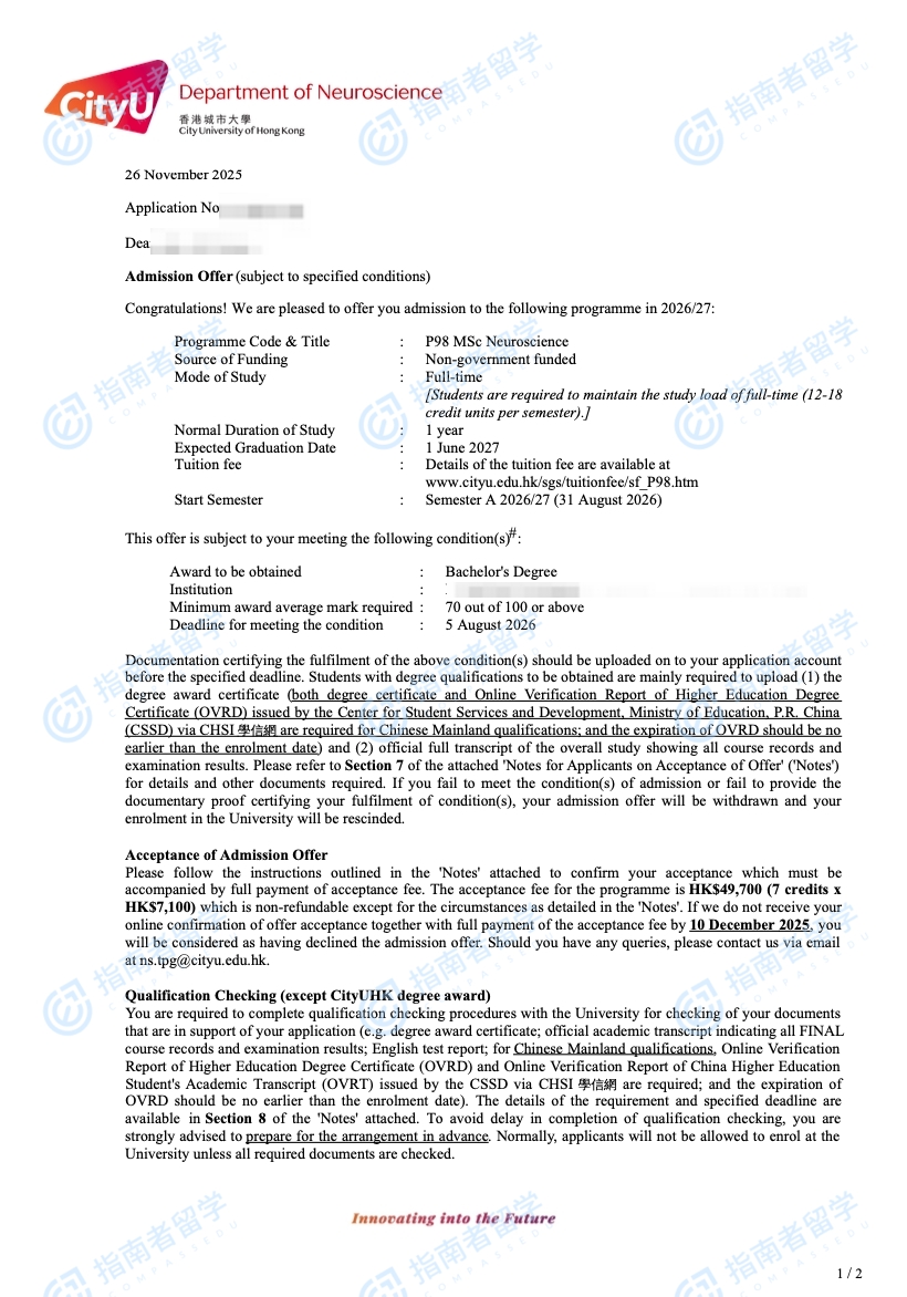香港城市大学健康科学与管理理学硕士研究生offer一枚