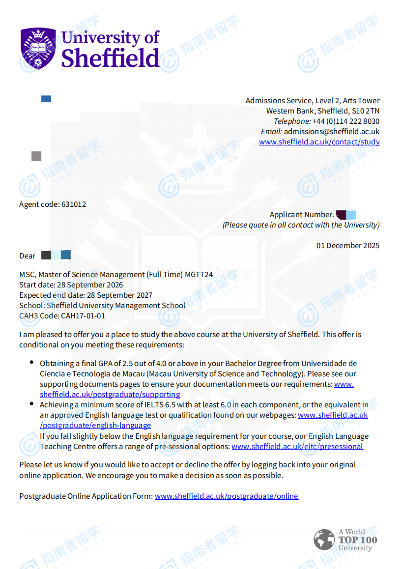 谢菲尔德大学管理学理学硕士研究生offer一枚