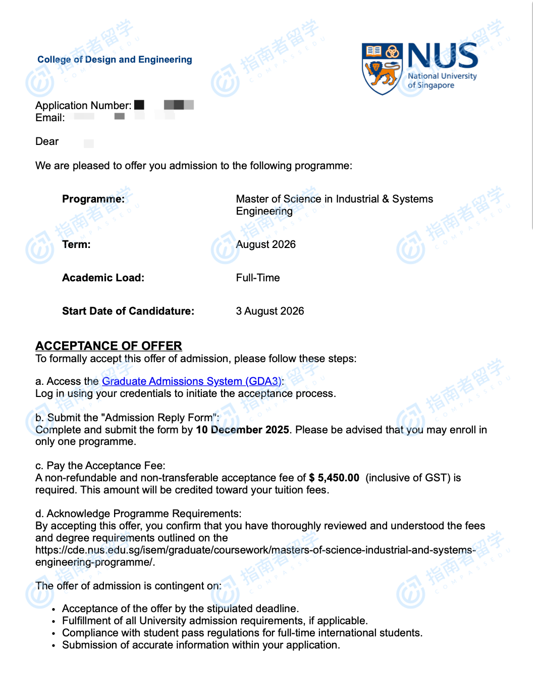 新加坡国立大学工业与系统工程理学硕士研究生offer一枚