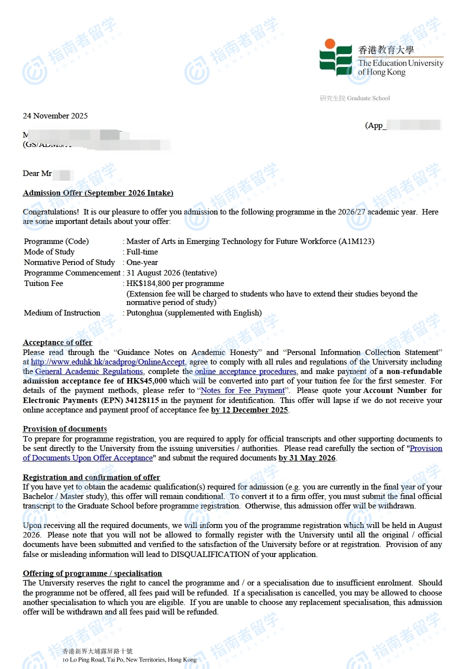 香港教育大学新兴科技赋能的未来人力文学硕士研究生offer一枚