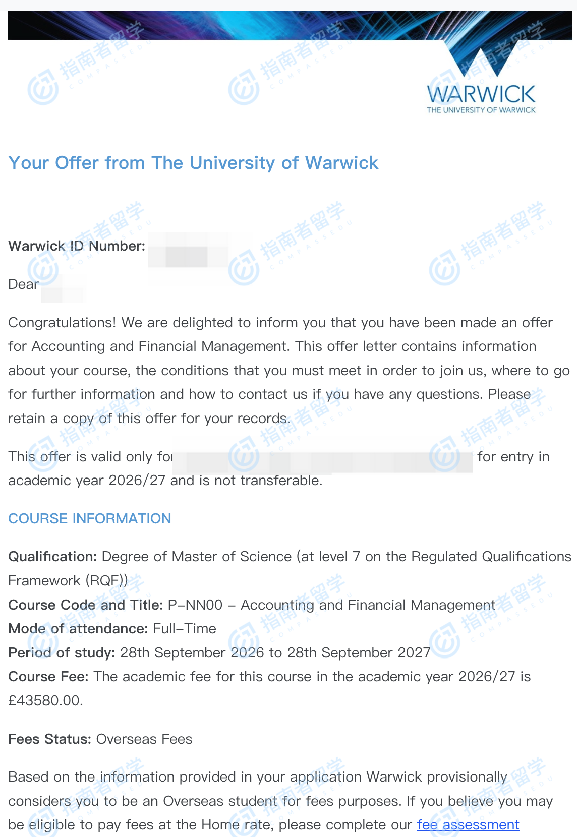 华威大学会计与财务管理理学硕士研究生offer一枚