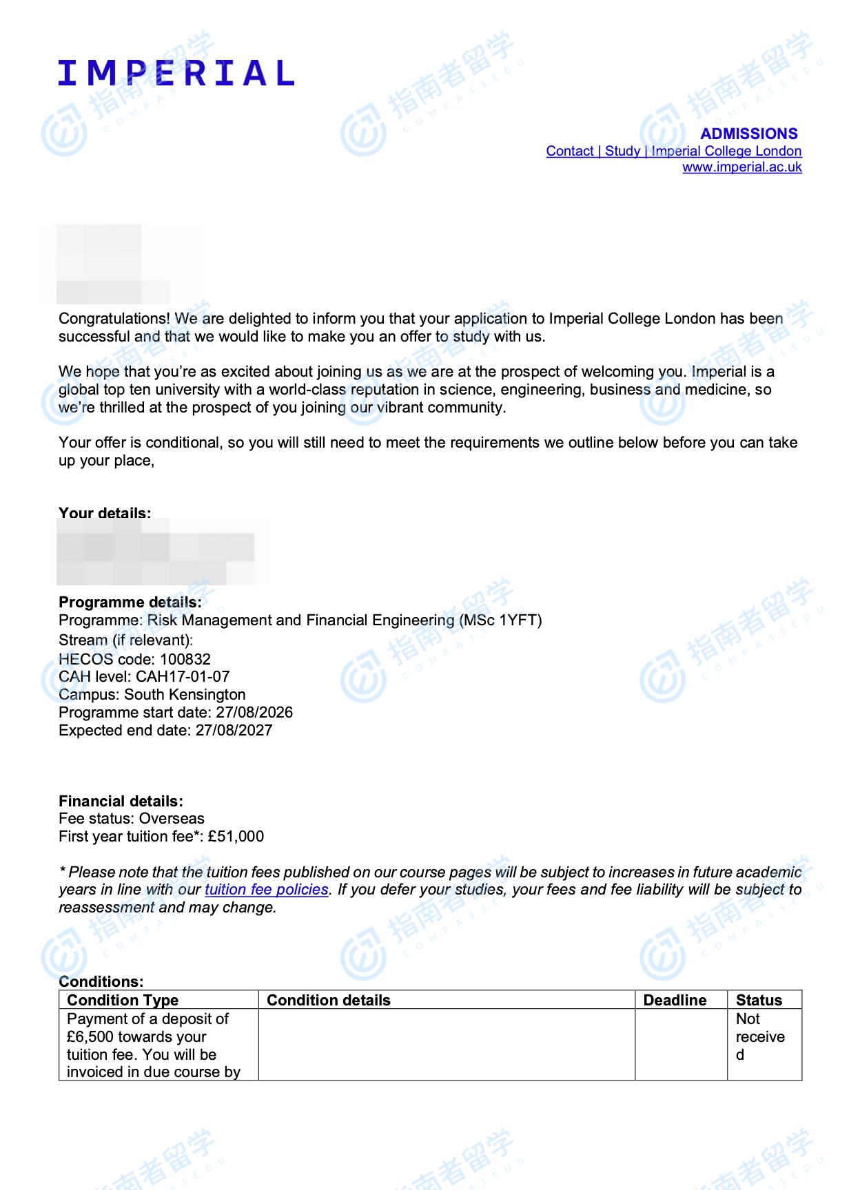 帝国理工学院风险管理与金融工程理学硕士研究生offer一枚