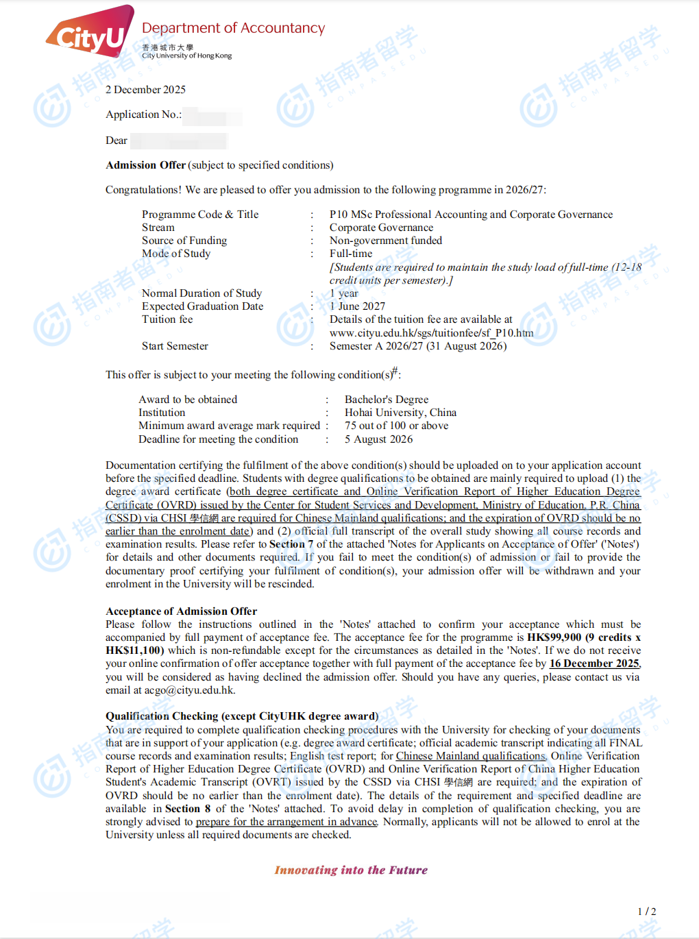 香港城市大学专业会计与企业管治理学硕士研究生offer一枚