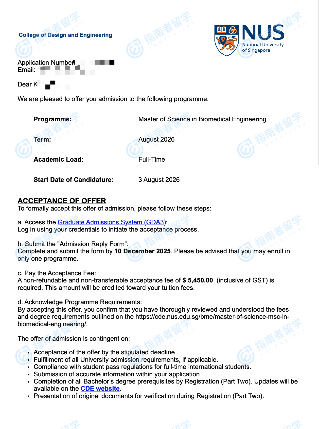 新加坡国立大学生物医学工程理学硕士研究生offer一枚