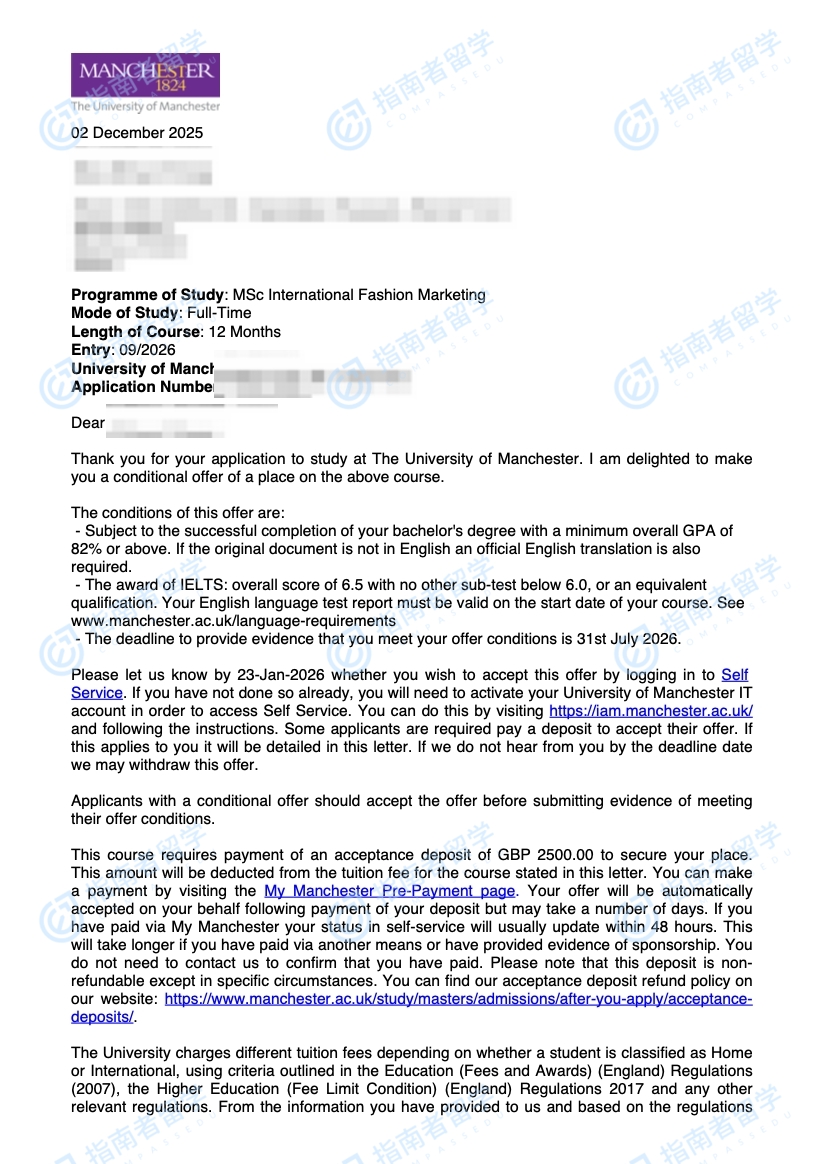 曼彻斯特大学国际时尚营销理学硕士研究生offer一枚