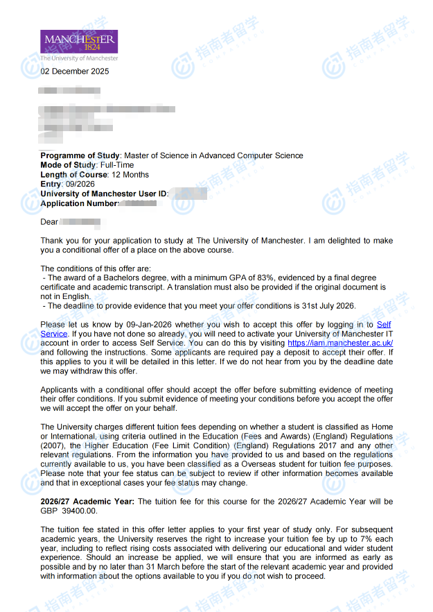 曼彻斯特大学高级计算机科学理学硕士研究生offer一枚