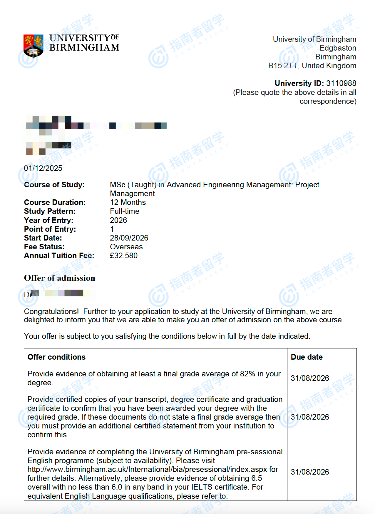 伯明翰大学高级工程管理(项目管理)理学硕士研究生offer一枚