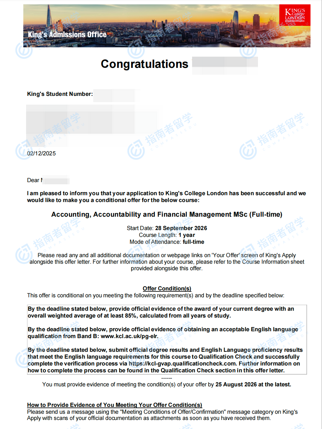 伦敦大学国王学院会计、问责与财务管理理学硕士研究生offer一枚