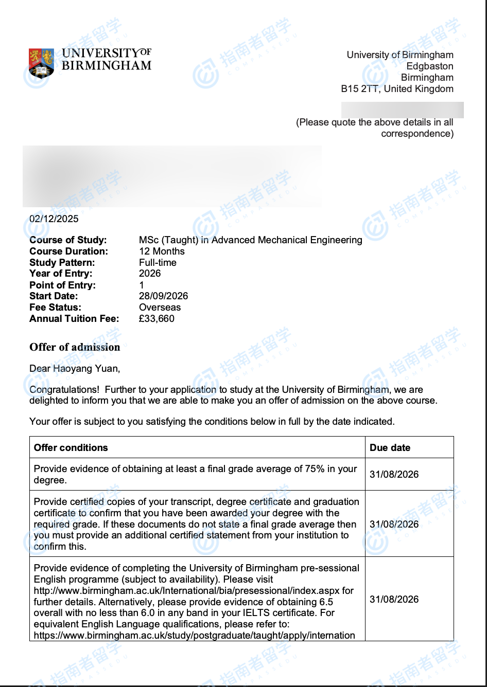 伯明翰大学高级机械工程理学硕士研究生offer一枚
