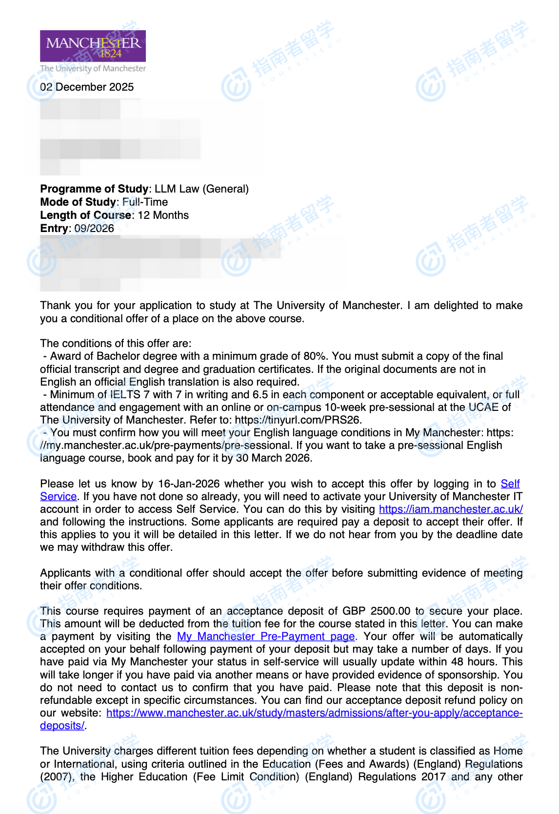 曼彻斯特大学法学硕士研究生offer一枚