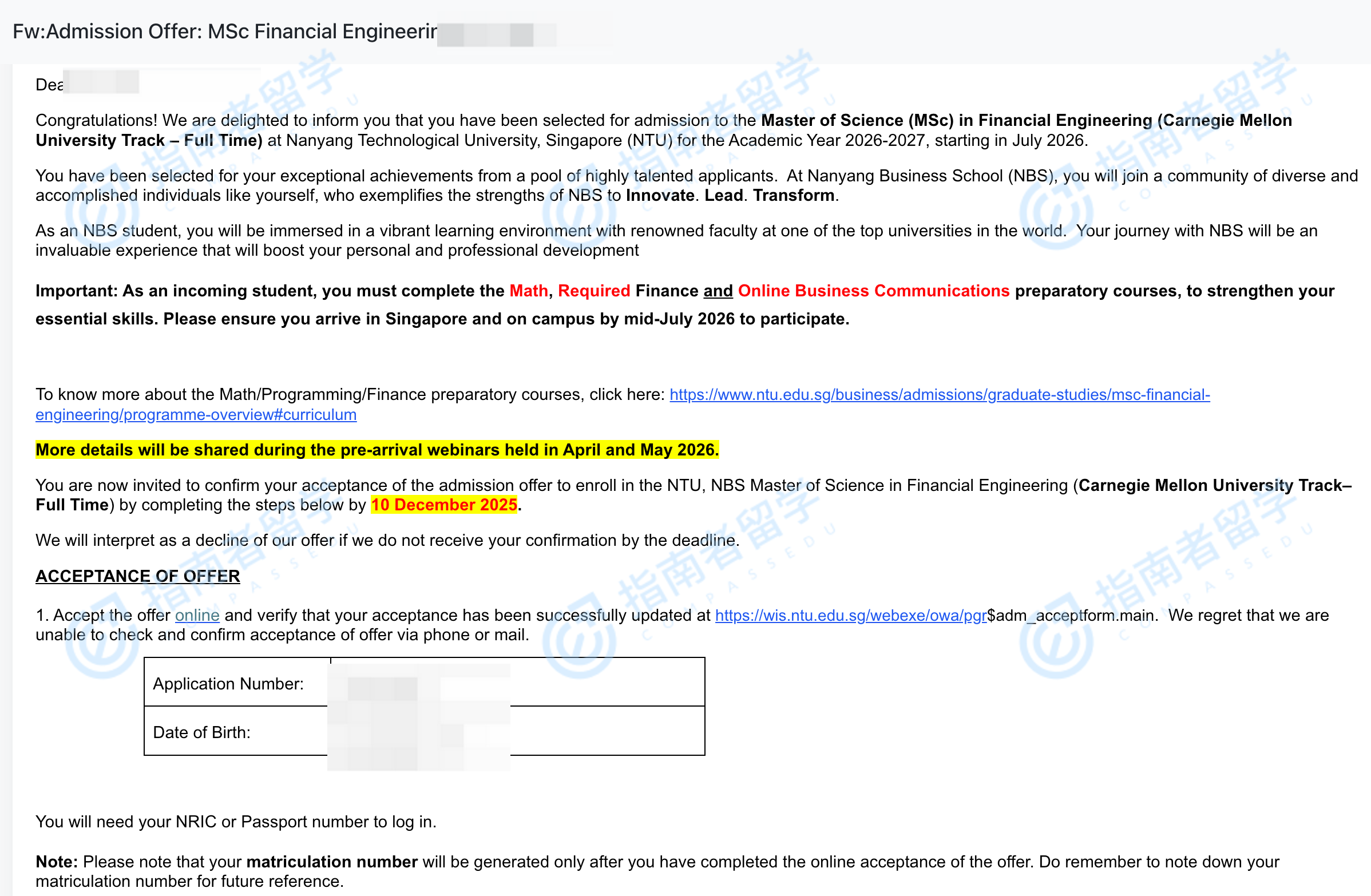 南洋理工大学金融工程理学硕士研究生offer一枚