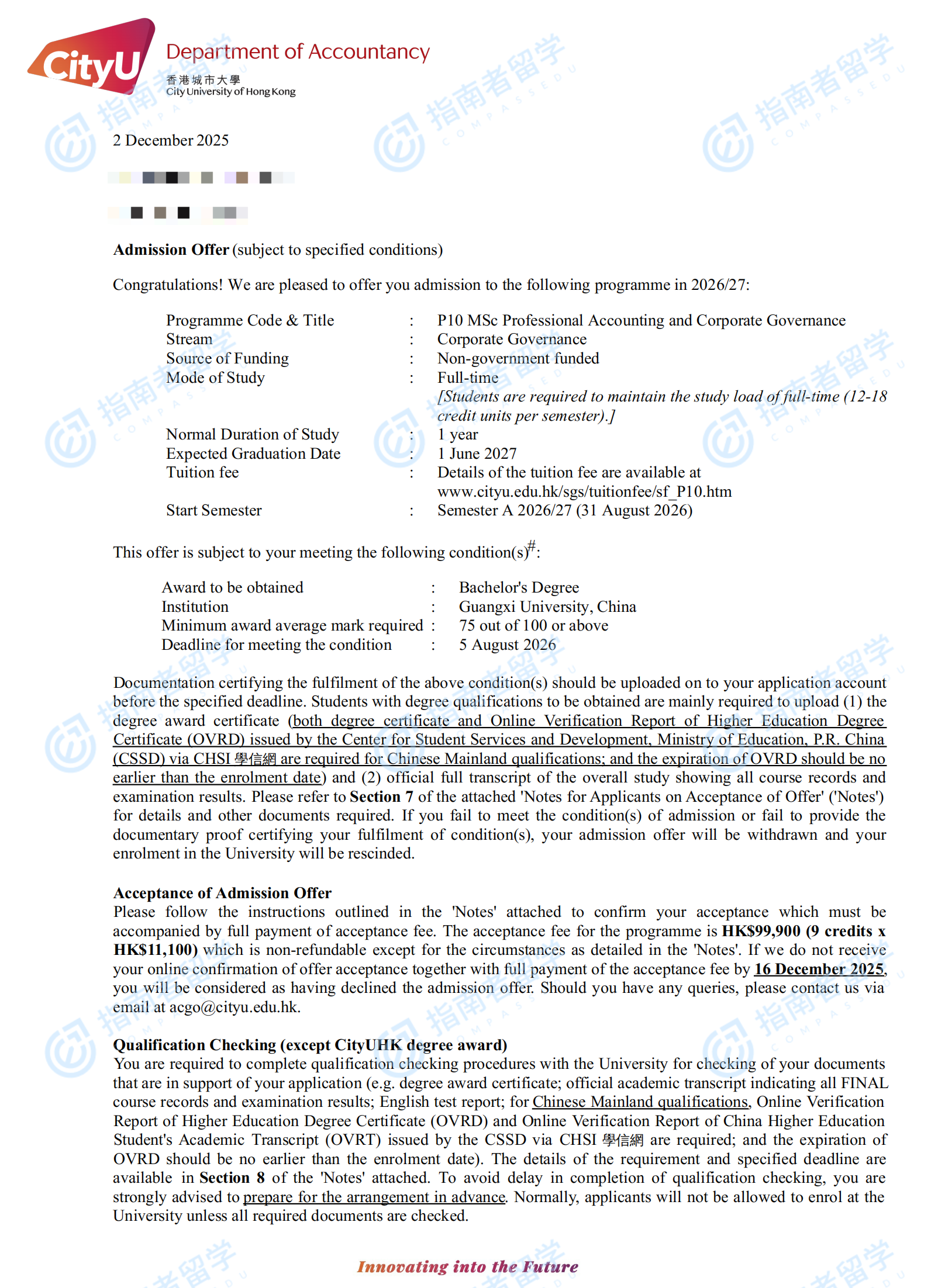 香港城市大学专业会计与企业管治理学硕士研究生offer一枚