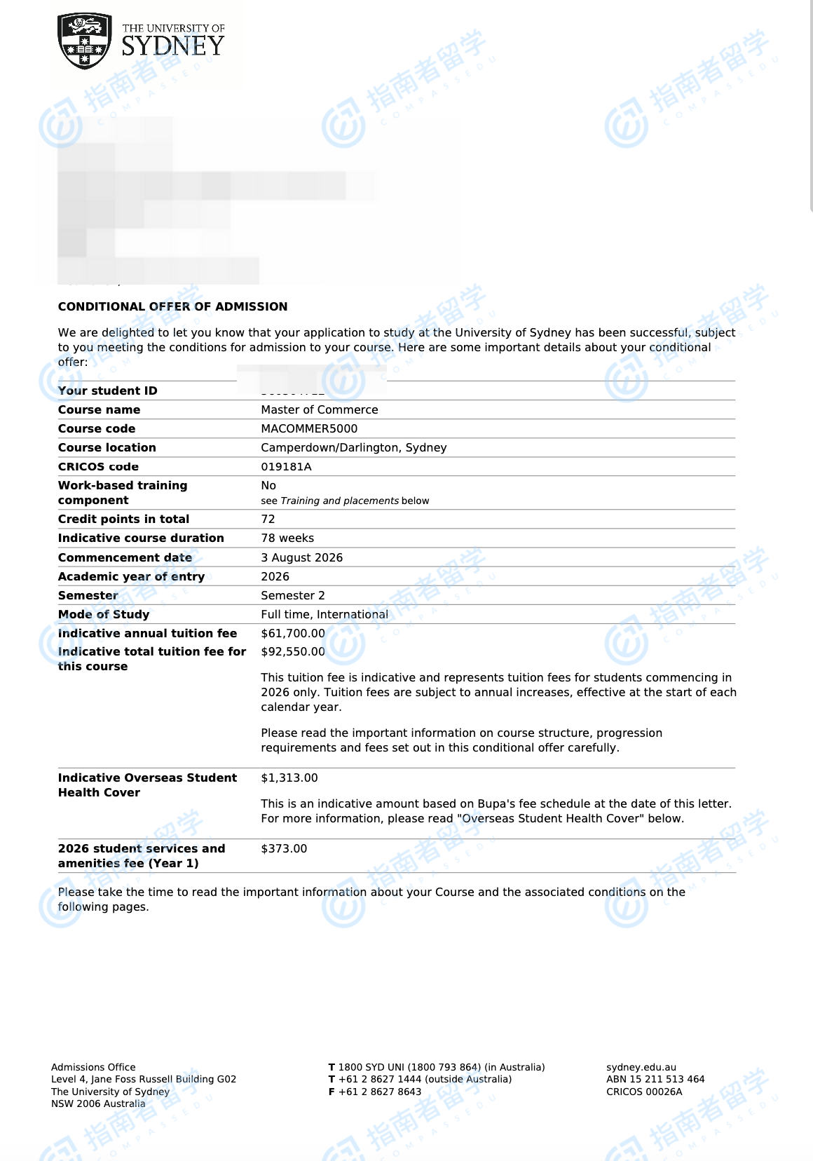 悉尼大学商学硕士研究生offer一枚