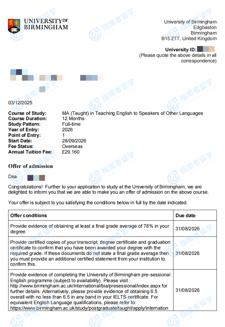 伯明翰大学对外英语教学文学硕士研究生offer一枚