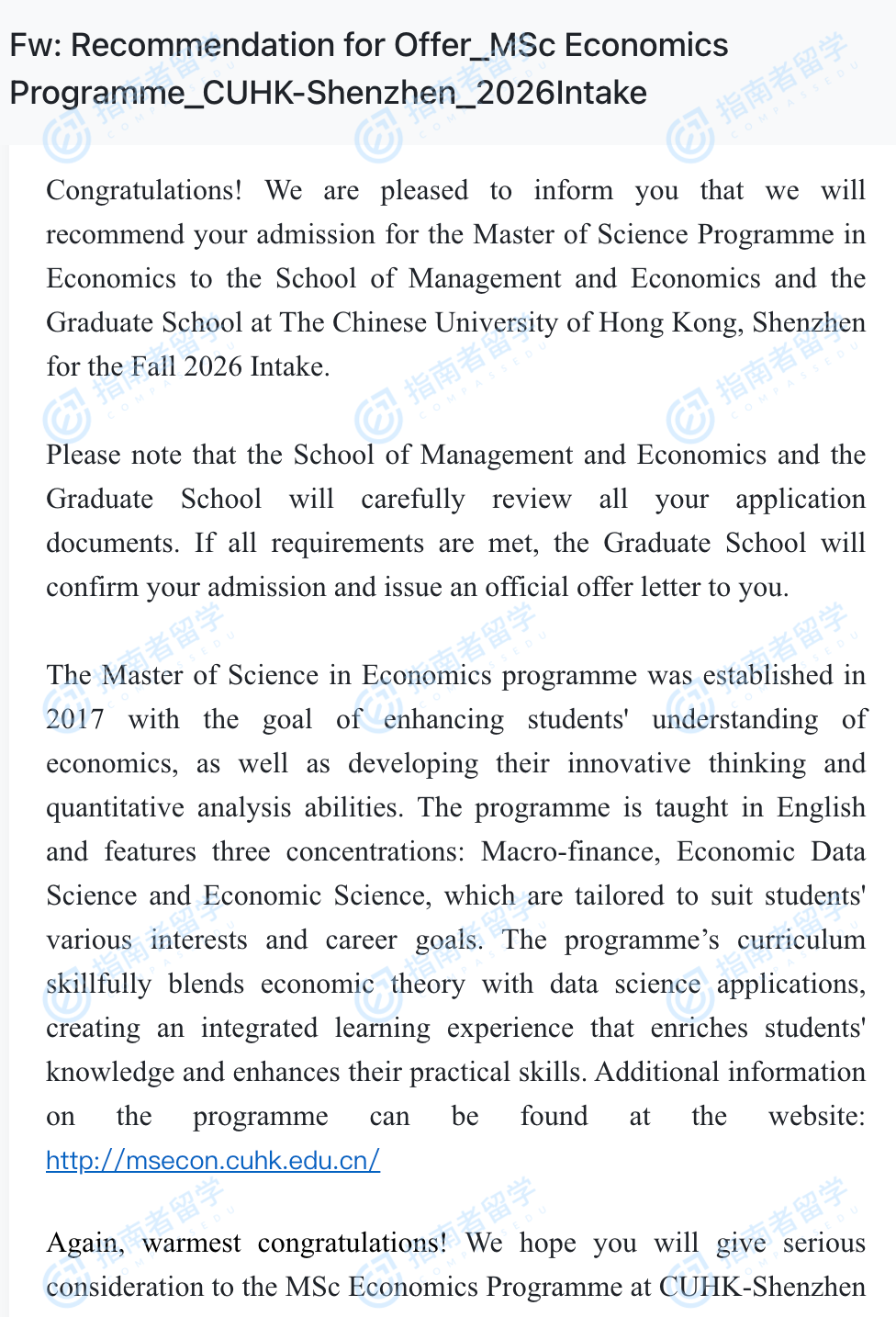 香港中文大学经济学理学硕士(CUHK-Shenzhen)研究生offer一枚