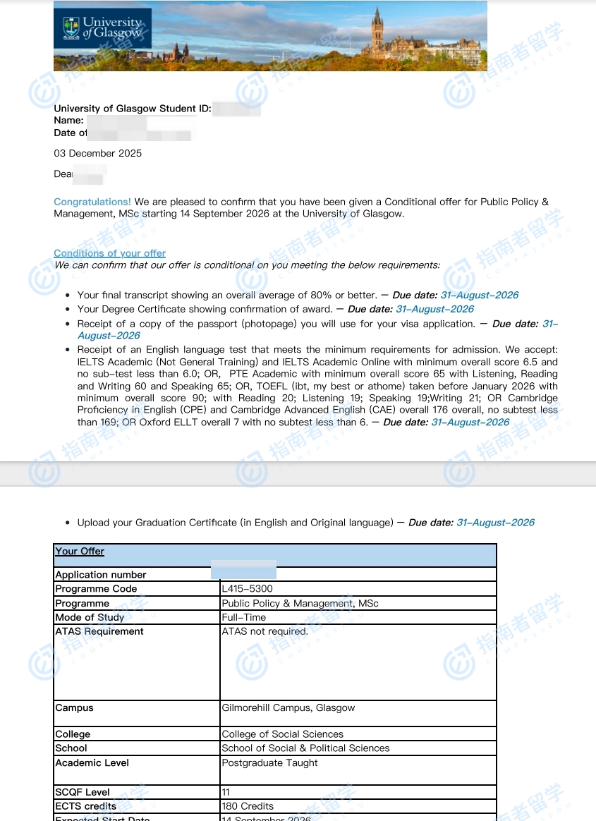 格拉斯哥大学公共政策与管理理学硕士研究生offer一枚