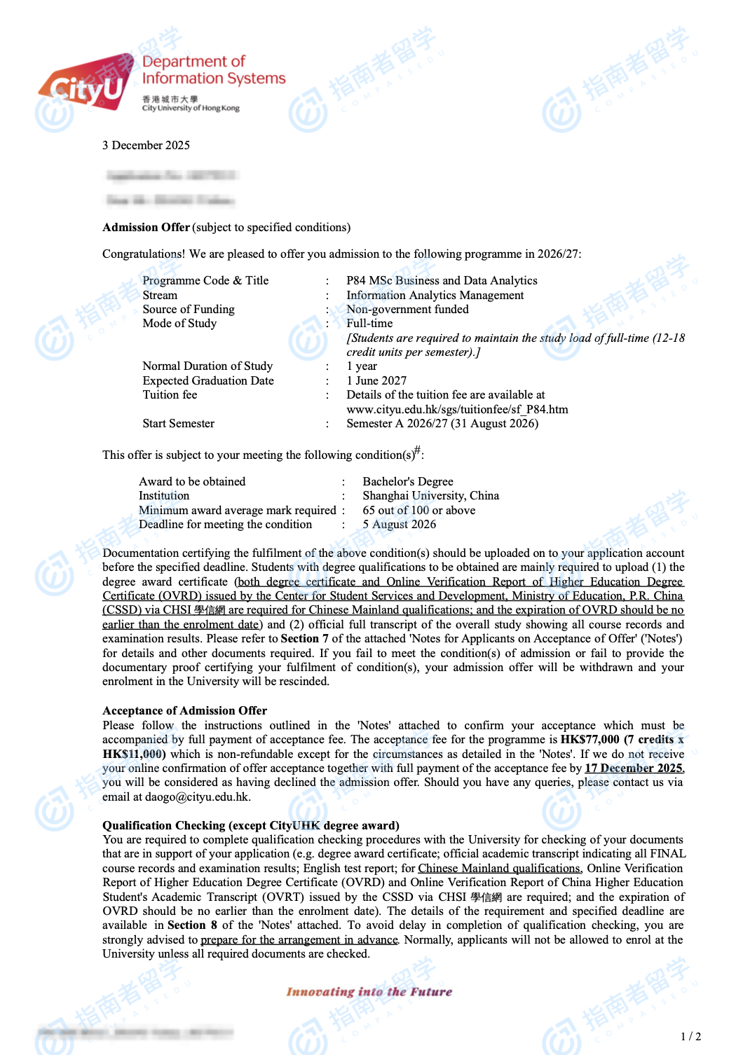 香港城市大学商业及数据分析理学硕士研究生offer一枚