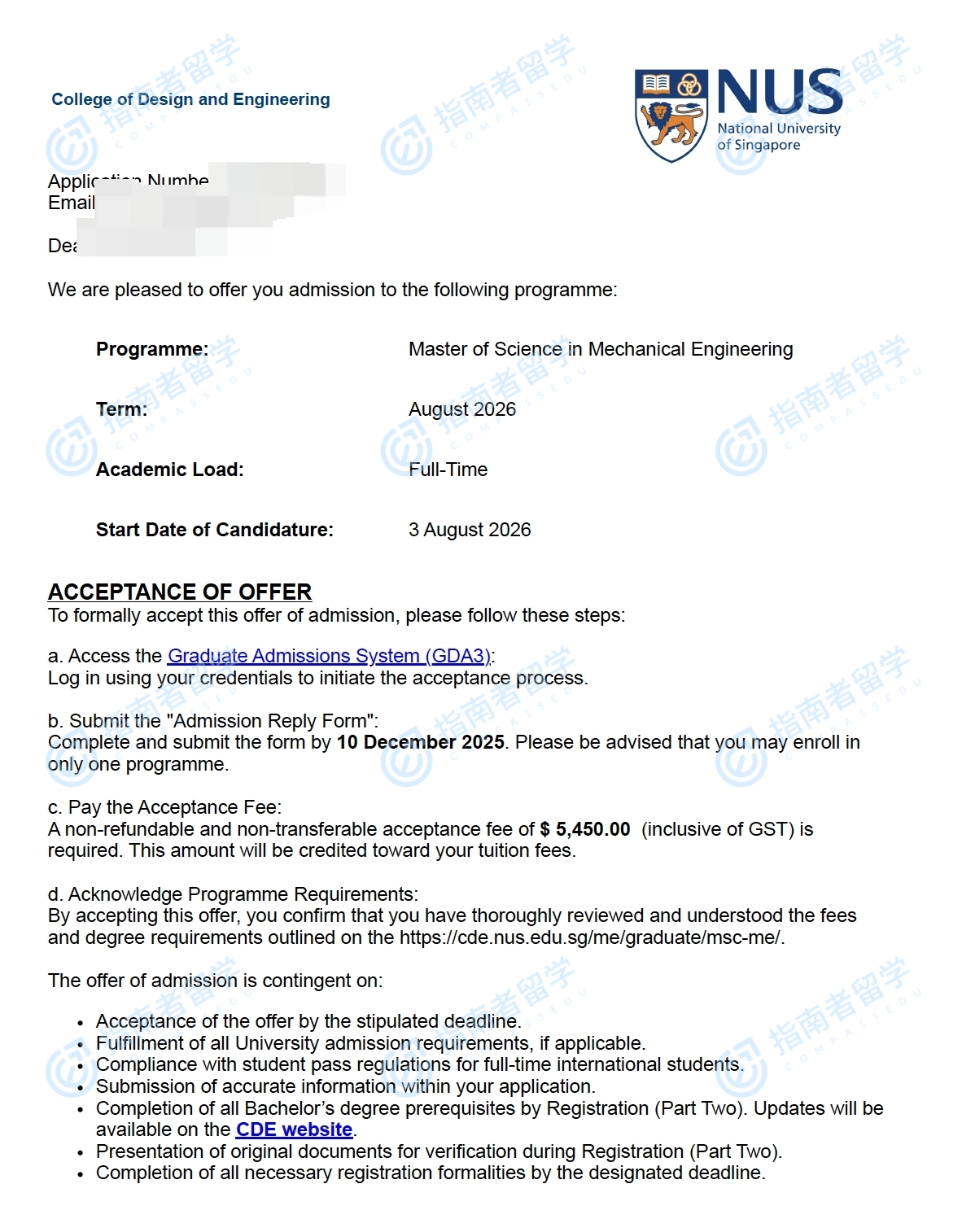 新加坡国立大学机械工程理学硕士研究生offer一枚