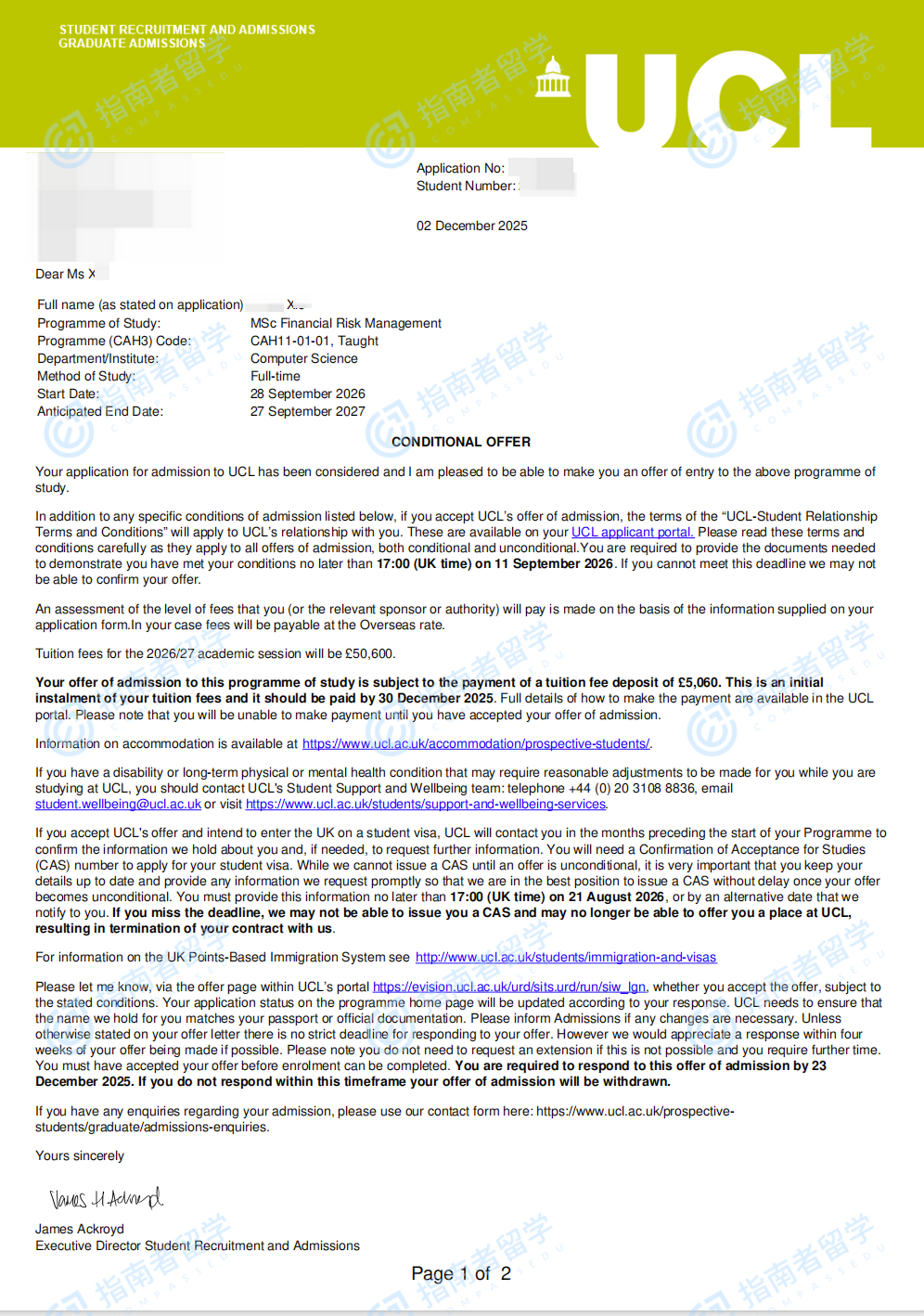 伦敦大学学院金融风险管理理学硕士研究生offer一枚