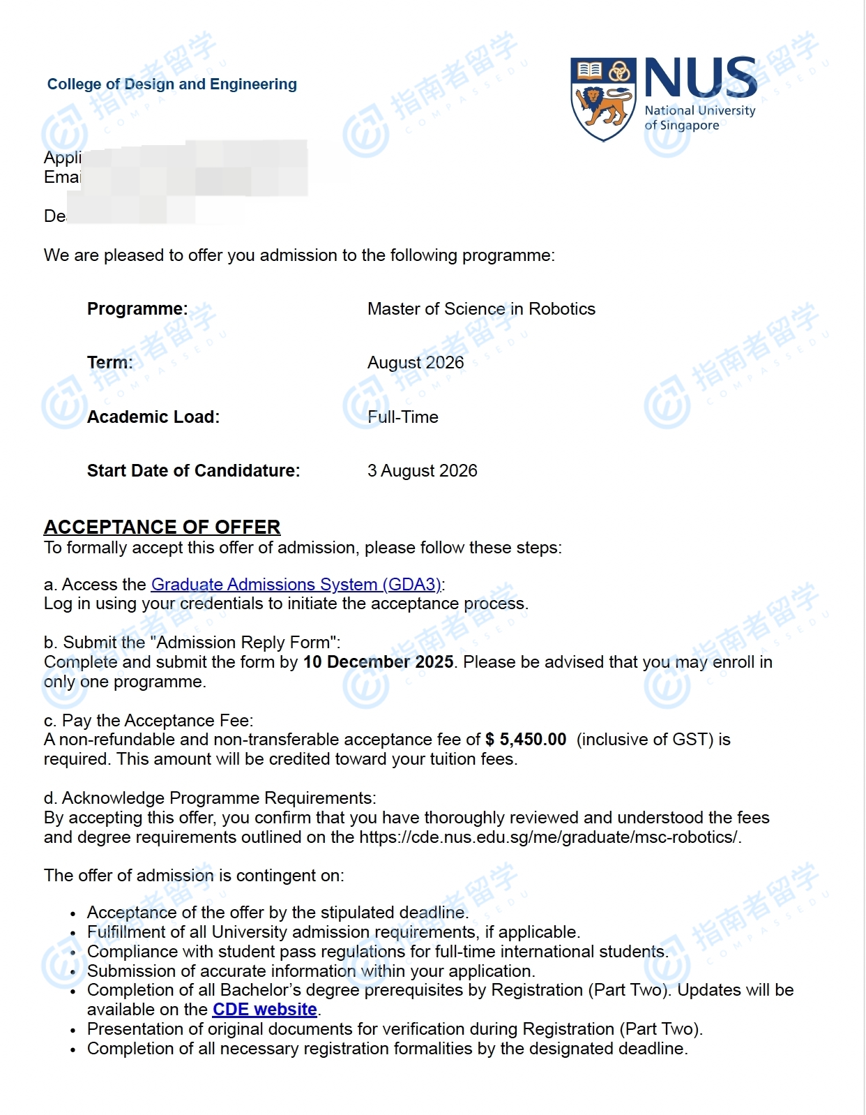新加坡国立大学机器人学理学硕士研究生offer一枚
